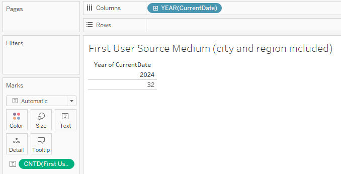 Adding Region seems to duplicate some of the First User Source Mediums. If I switch to Count Distinct on First User Source Mediums, the numbers match: